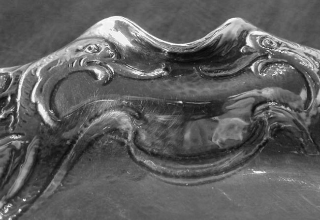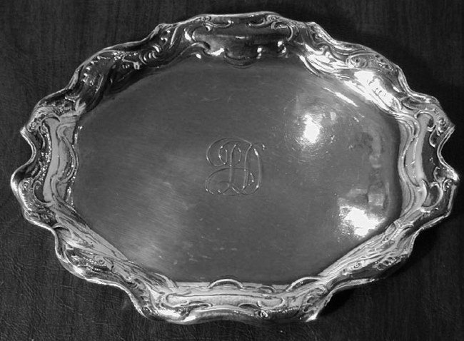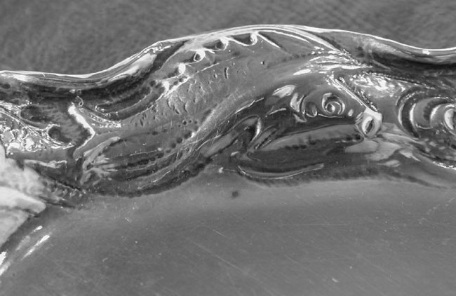 Description: The tray is the under tray for a butter boat (for serving fish). It is a Sample completed October 2, 1897 making it one of the earliest pieces of Martele, and produced in the the sterling standard (sterling Martele was only made during 1897). The tray was made in 8 hours, and chased for an additional 6 hours. Unfortunately the specifc craftsmen for the earlier pieces are not identified in the Gorham production documentation. The tray is about 7 3/4 inches by 5 1/4 inches. It weighs 7.8 troy ounces.