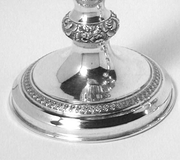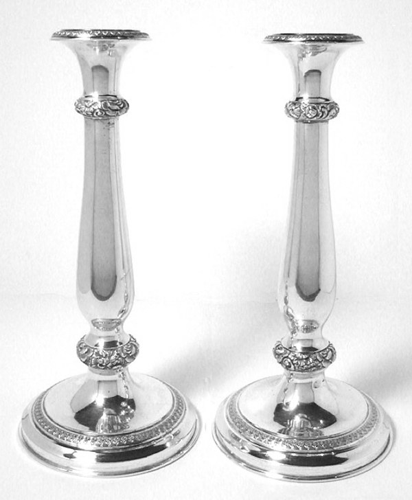 Description: The candlesticks are 10 3/8 inches tall. They are decorated with acanthus leaves and darts around the nozzle, with repousse floral works in two places o the stems. There is a band of flower around the base (look something like sun flowers). The candlesticks are not weighted, and are a combined total of 14.4 troy ounces. They are clearly marked on the base.