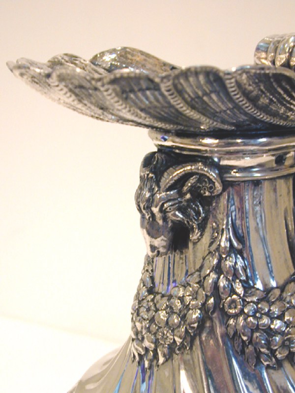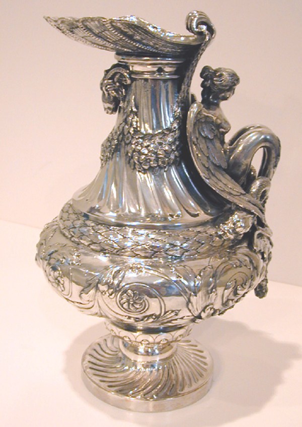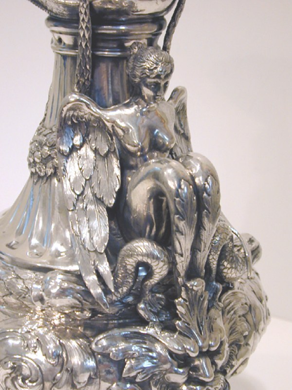 Description: The pitcher is an unusual combination of 19th century design, set off by a figural handle depicting a winged, serpent legged nude with dolphins and a mask at her feet (fins). Under the spout is a rams head. Nice, heavy gauge piece. The jug stands 10 1/8 inches tall to the tip of the spout. It weighs an impressive 43.5 troy ounces.