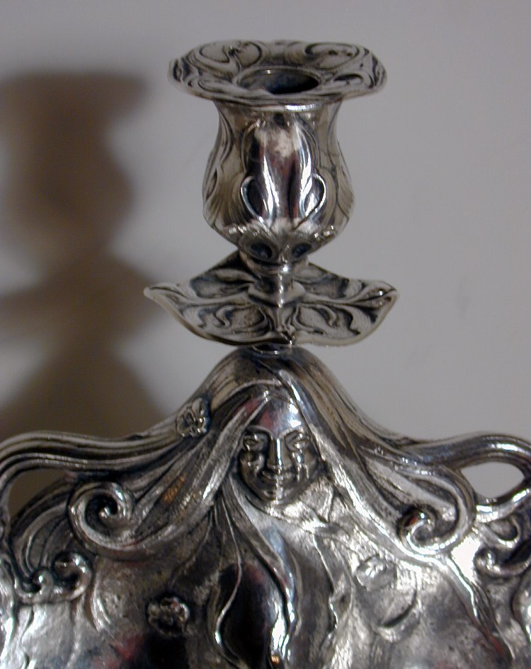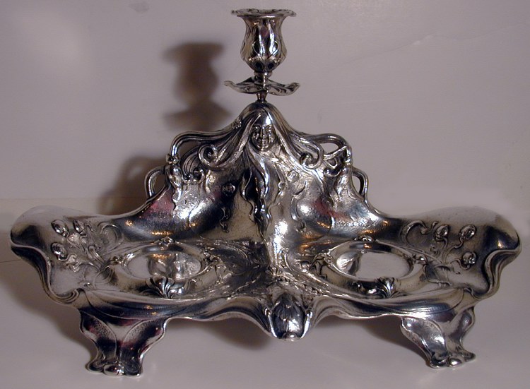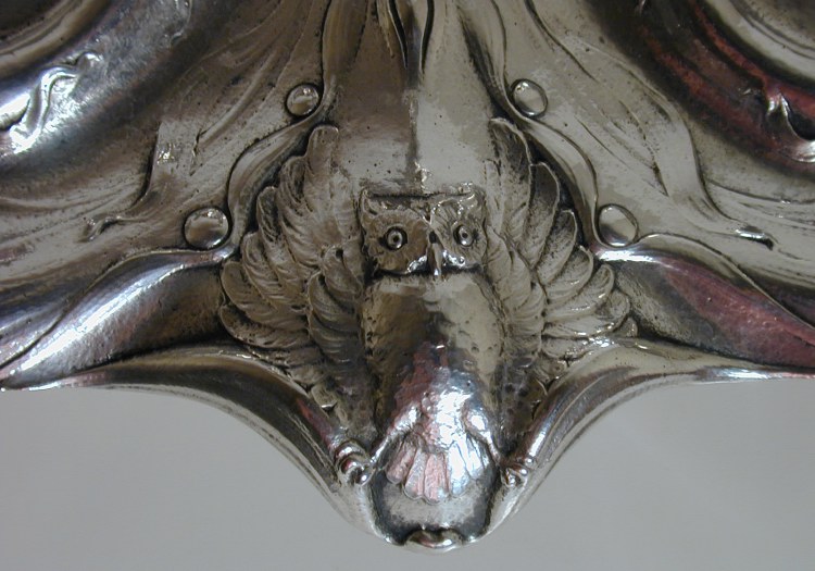 Description: The B1713 inkstand is a "Martele effect" item. B1713 was cast from the mold produced from the PY Martele inkstand. Several pieces of Martele are know to have been cast in sterling silver (instead of .950 or .9584) as part of the "B" line and listed by the company as "Martele effect". Essentially the Martele effect items are Martele, either cast (from molds made from Martele pieces) or made in sterling silver when the Martele standard was, at the time, either .950 or .9584. The records indicate the inkstand was completed April 2, 1903. Making was in 8 hours by an unidentified maker, there was 5 hours of casting, with the chasing by Karl Wendt for an additional 9 hours. However, the current stand weighs 32.49 troy ounces (the records indicate 28.50) which suggests more than one stand was made. The inkstand is a large desk item being 12 3/16 inches long and 6 3/4 inches high.